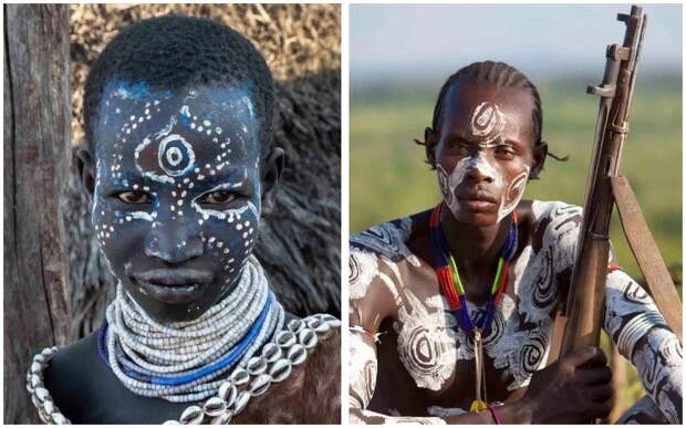 Потрясающие снимки демонстрируют жизнь племени каро — самого маленького в Эфиопии. Члены общины покрыты с головы до ног боевыми орнаментами из краски на основе пепла и животного жира. Аборигены носят одежду из кожи животных, украшая ее белыми ракушками. Почти у всех мужчин есть ружья, подаренные им европейскими туристами 50 лет назад.