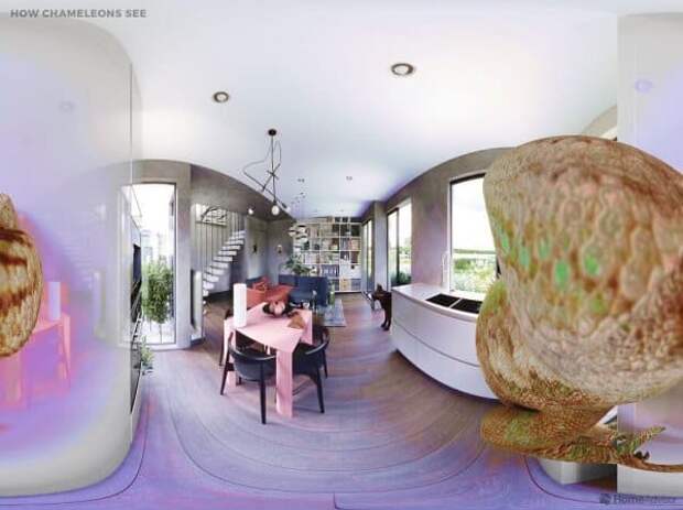 Компания HomeAdvisor придумала занятный проект: они создали виртуальную комнату, в которой находится 7 животных: собака, кошка, аквариумная рыба, змея, паук, попугай и хамелеон. Авторы показать, как эти звери видят окружающий нас мир. Получилось интересно и познавательно. Давайте посмотрим.