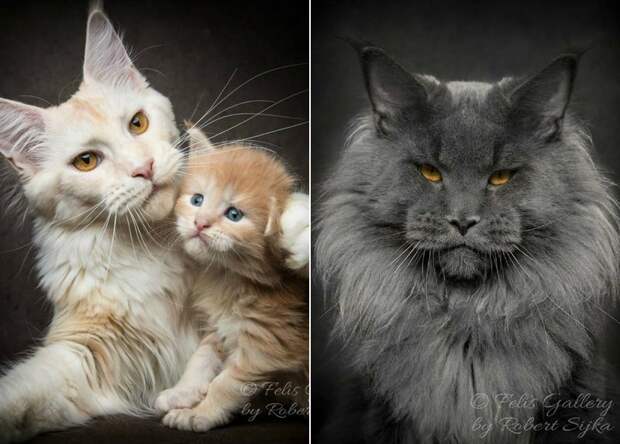 Фотограф из Гонконга Роберт Сижка (Robert Sijka) уже не первый год знакомит мир с мейн-кунами — самыми крупными кошками среди одомашненных пород. Массивные черты, богатая шерсть, и устрашающе-величественный взгляд придают этим кошкам вид настоящих мини-львов. Роберт Сижка любит совмещать две своих страсти: фотографию и мейн-кунов.
