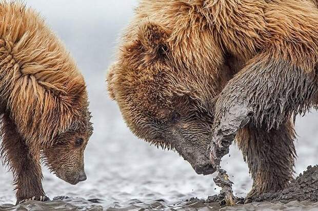 Первый раз во время отлива новорожденные медвежата отправились с матерью на поиск ракушек. Малышам интересно все, что их окружает.